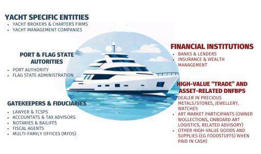 The Yachting ecosystem involves many different parties who may have their own compliance obligations; yacht brokers, lawyers, lenders, high-value goods suppliers, TCSPs, Fiscal Agents, Port Authorities, Resident Agents etc. Understanding their obligations, which will depend on the jurisdictions in which they operate, is important to manage the international operations of the yacht.